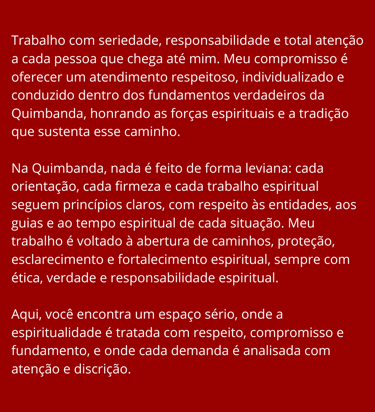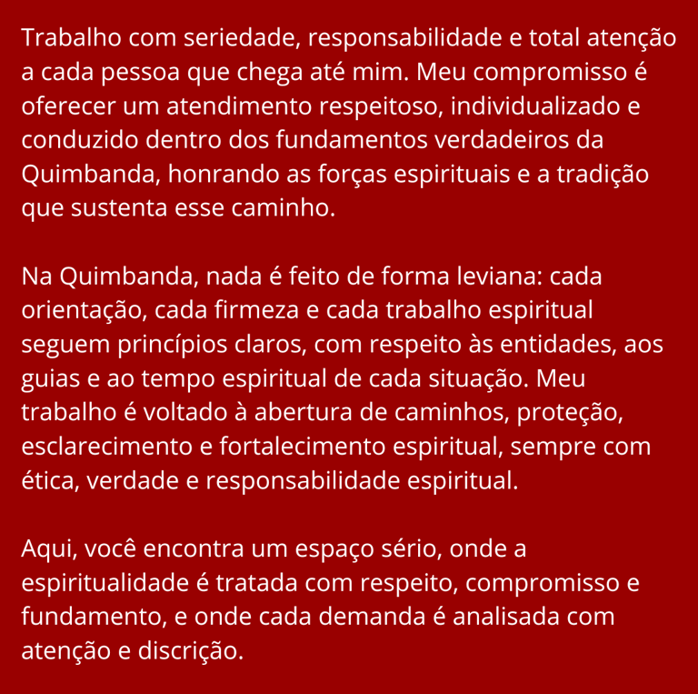 As consultas são conduzidas com seriedade, atenção e total respeito espiritual. Cada atendimento é individual, sigiloso e realizado com base nos fundamentos da Quimbanda, sempre buscando clareza, orientação e direcionamento verdadeiro para cada situação apresentada.