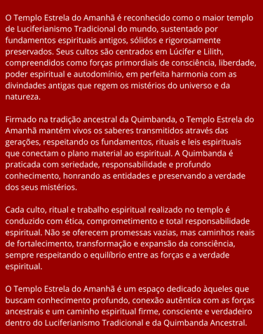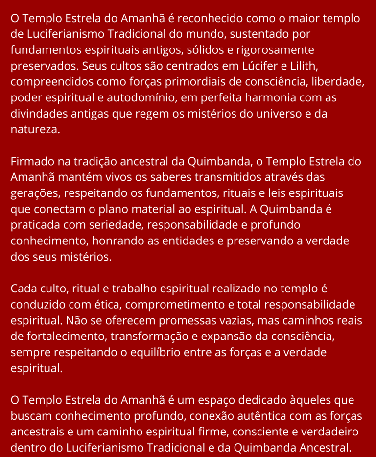 Essas feitur as estão disponíveis para quem verdadeiramente deseja trilhar esse caminho, desde que haja preparo, respeito e compromisso com a tradição. Cada processo é realizado de forma individual, consciente e responsável, honrando os fundamentos ancestrais e a verdade espiritual que sustenta tanto o Luciferianismo quanto a Quimbanda.